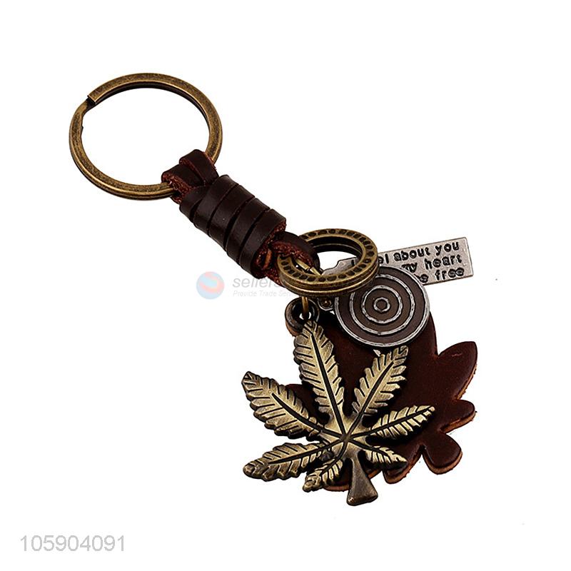 Best selling retro alloy leaf pendant weaving leather key chain
